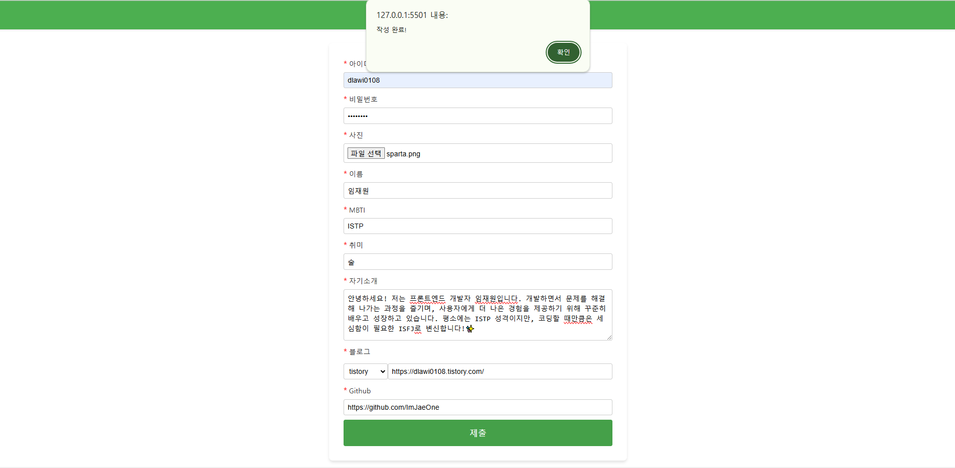 저는 멤버 카드 Form을 만들었습니다. 처음에는 회원가입 기능을 생략하고 DB에 userId와 userPw를 미리 넣어놓은 채로 진행하려 했지만, 백엔드에 신경 쓰기보다는 프론트엔드 기능에 중점을 두기로 했습니다. 그래서 멤버 카드 생성과 회원 가입 기능을 함께 구현하기로 했습니다.