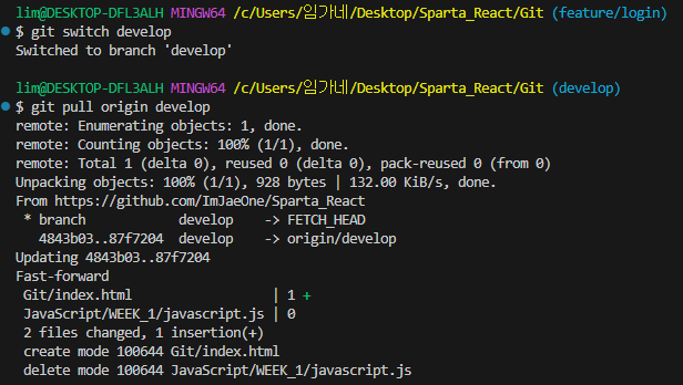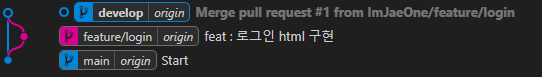 그 후에 develop 브랜치에서 pull을 진행하면 merge가 된 것을 확인할 수 있습니다.