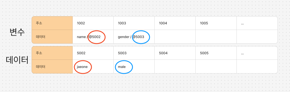 'jaeone'이 메모리 주소 5002에 저장되고, 'male'이 주소 5003에 저장됩니다.