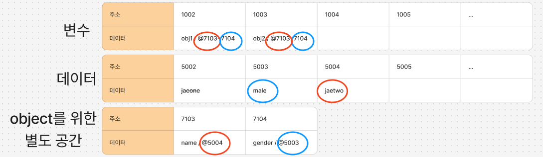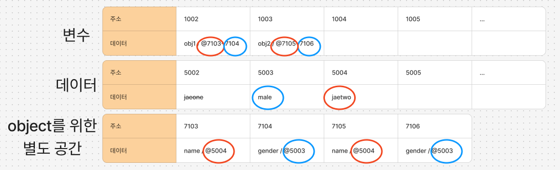 obj1가 저장된 주소 1002에서 속성명 name과 gender의 메모리 주소 7103과 7104를 참조합니다.