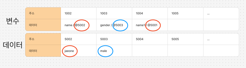 name이 저장된 주소 1002에서 'jaeone'이 저장된 주소 5002를 참조합니다