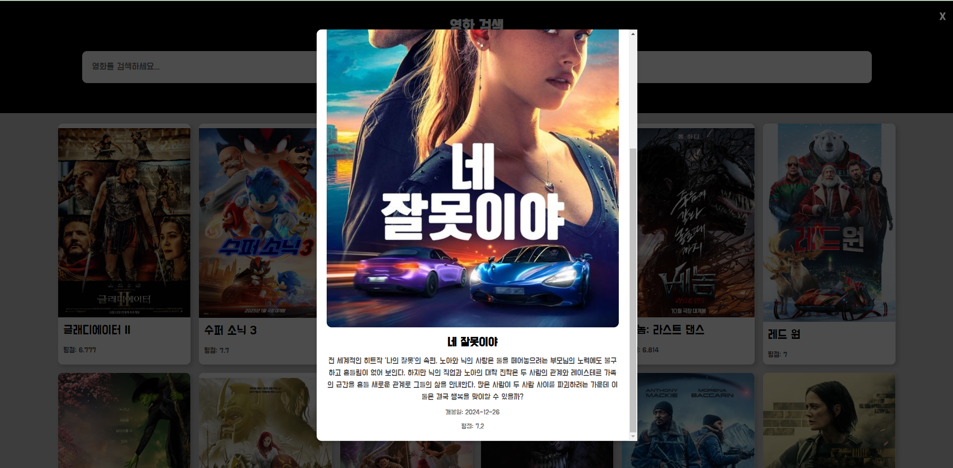 2. 각 영화 아이템을 누르면 상세 페이지 모달로 구현(movie-id 값을 통한 상세 정보 불러오기)
