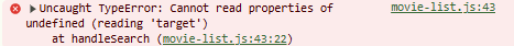 e은 Input 이벤트 객체로 searchInput 요소가 찍혀야 하는데 handleSearch의 이벤트 객체가 출력되는 것을 확인할 수 있습니다.
