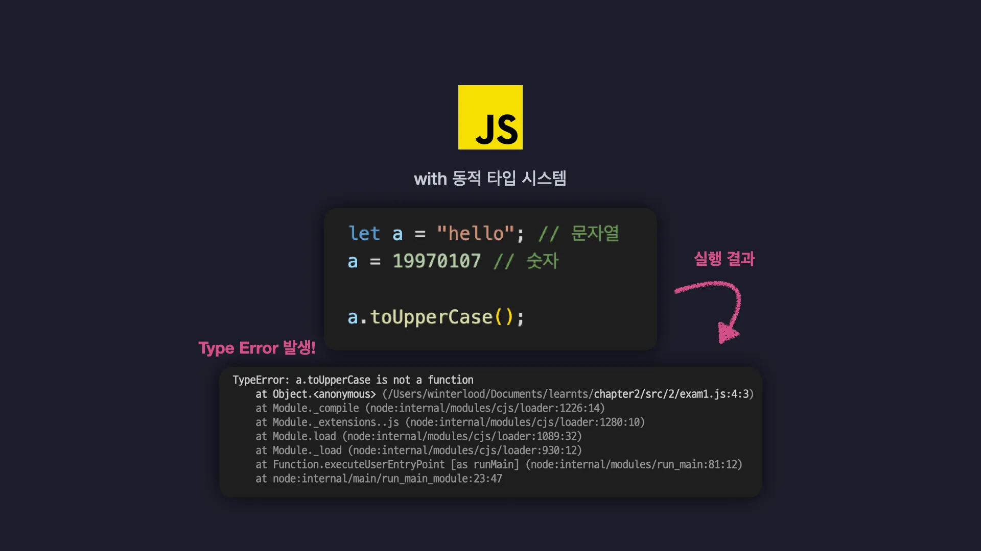 동적 타입 시스템은 코드를 실행한 후 유동적으로 변수의 타입을 결정하는 시스템이다. (JavaScript, Python)