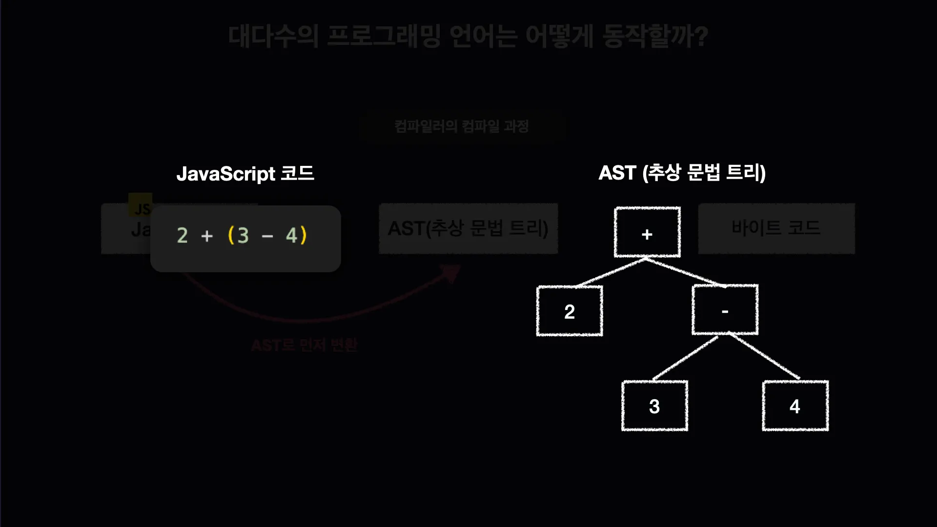 컴파일러를 통해 코드를 바로 바이트코드로 변환하는 것이 아닌 AST(추상 문법 트리)라는 형태로 변환한다.