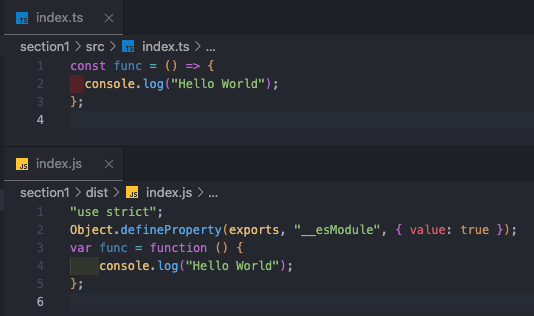 ES5의 문법으로 변환되어 컴파일 된 것을 확인할 수 있다.