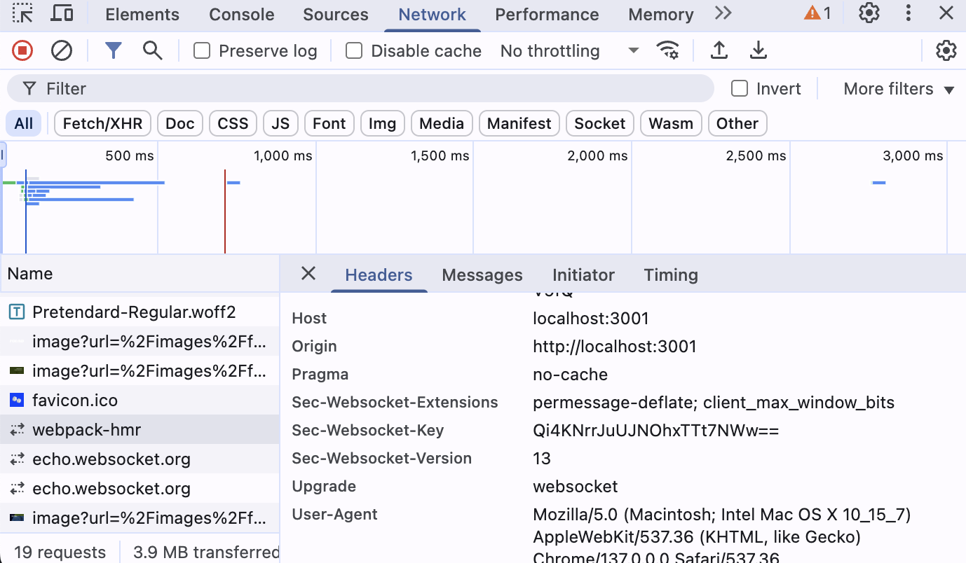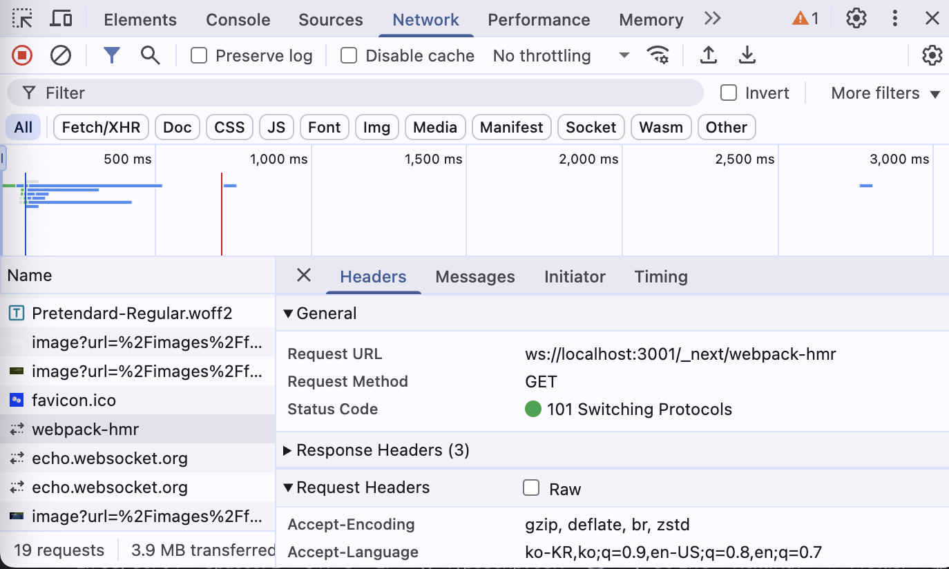 웹 소켓이란 단일 연결을 통해 지속적이고 전이중 통신 채널을 설정한다. 즉, 데이터는 클라이언트에서 서버로, 그리고 반대로 독립적이고 동시에 전송될 수 있으며 여러 요청이 필요하거나 응답을 기다릴 필요가 없다. 'pnpm run dev', 즉 개발 서버로 실행했을 때 코드를 저장할 시 브라우저에 자동으로 반영되는 것을 볼 수 있다.