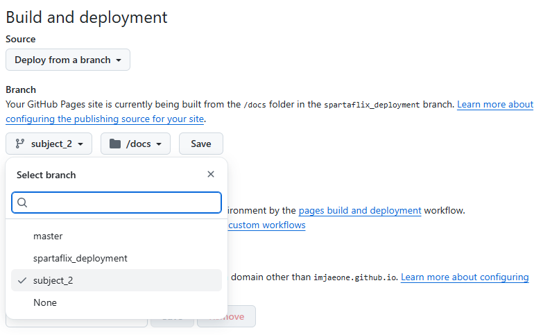 이후 저희는 docs라는 폴더를 배포할 것이기 때문에 /docs를 선택해준 후 Save를 누릅니다.