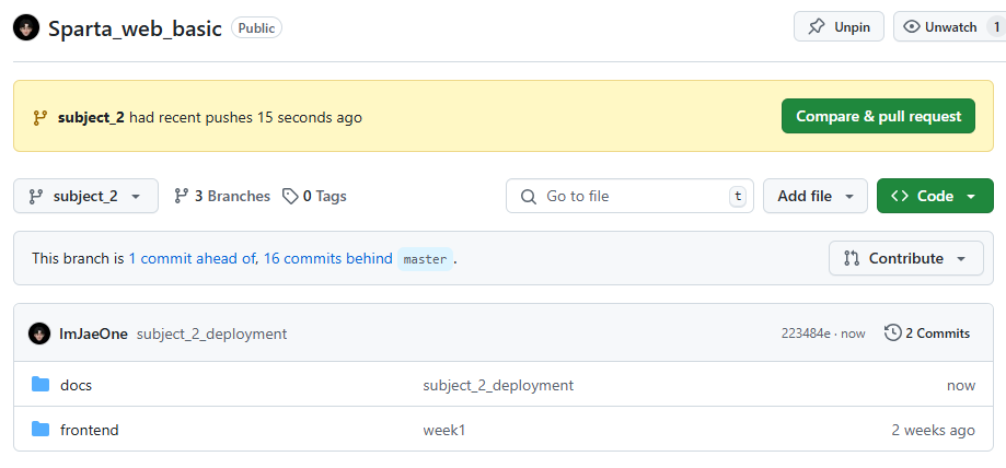 새로 생성한 subject_2 브랜치를 선택해줍니다.
