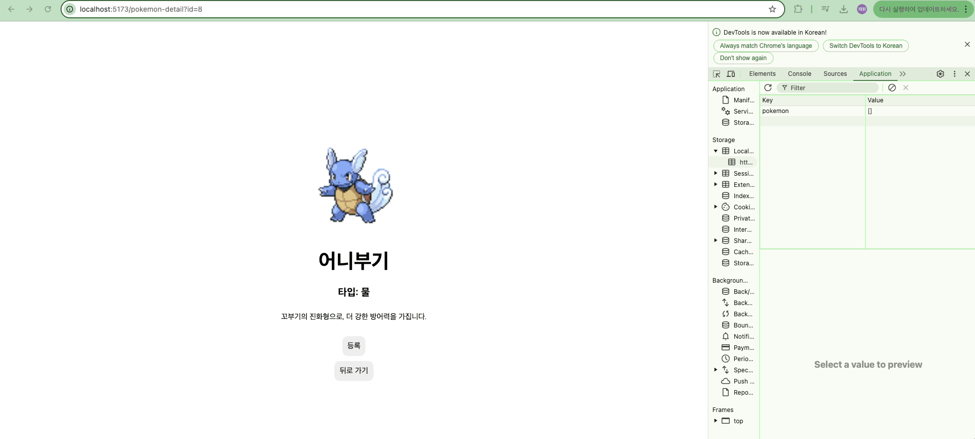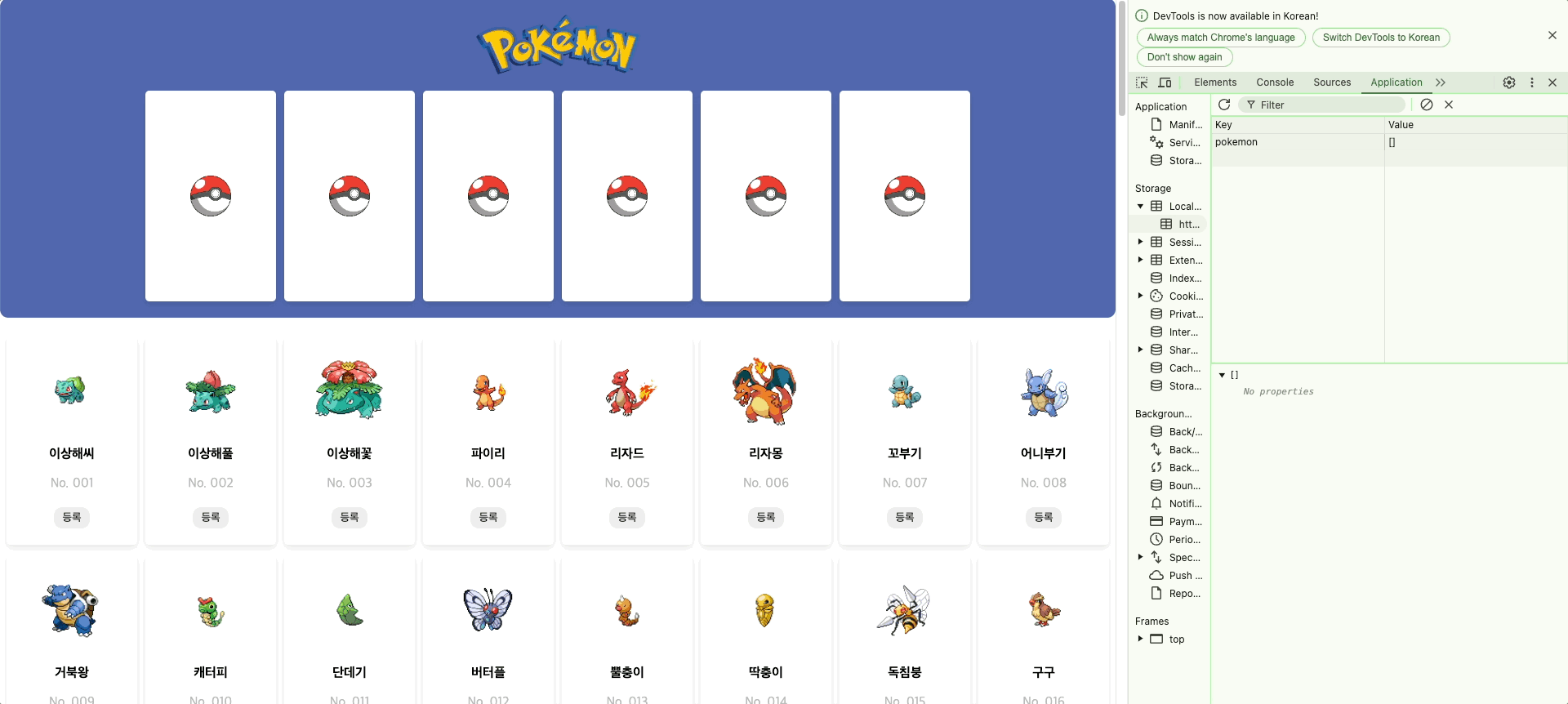 등록을 하고 새로고침을 한 후 직전페이지로 넘어가면 등록되어 있는 포켓몬이 하나도 없는 불상사가 일어납니다.